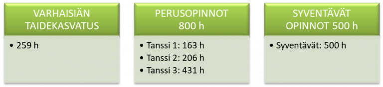 Opintojen laajuus on yhteensä 1300 tuntia (45 min.). Opinnot jakautuvat kahteen osaan. Perusopinnot jakautuvat kolmeen kolmivuotiseen kokonaisuuteen (Tanssi 1–3), jotka suoritetaan noin 7–16-vuotiaana. Syventävät opinnot rakentuvat yhdestä kolme vuotta kestävästä kokonaisuudesta. Nämä opinnot ajoittuvat ikävuosille n. 16–19 v.